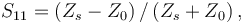 With this understanding of impedance and how it varies with frequency, we can also address why the power excitation behaves differently over frequency. The power excitation instead represents an incoming signal that is partially reflected out of, and partially absorbed into, the model. The reflection is given by the S-parameter. For a one-port system, this can be computed from Z_s and Z_0, the cable impedance: