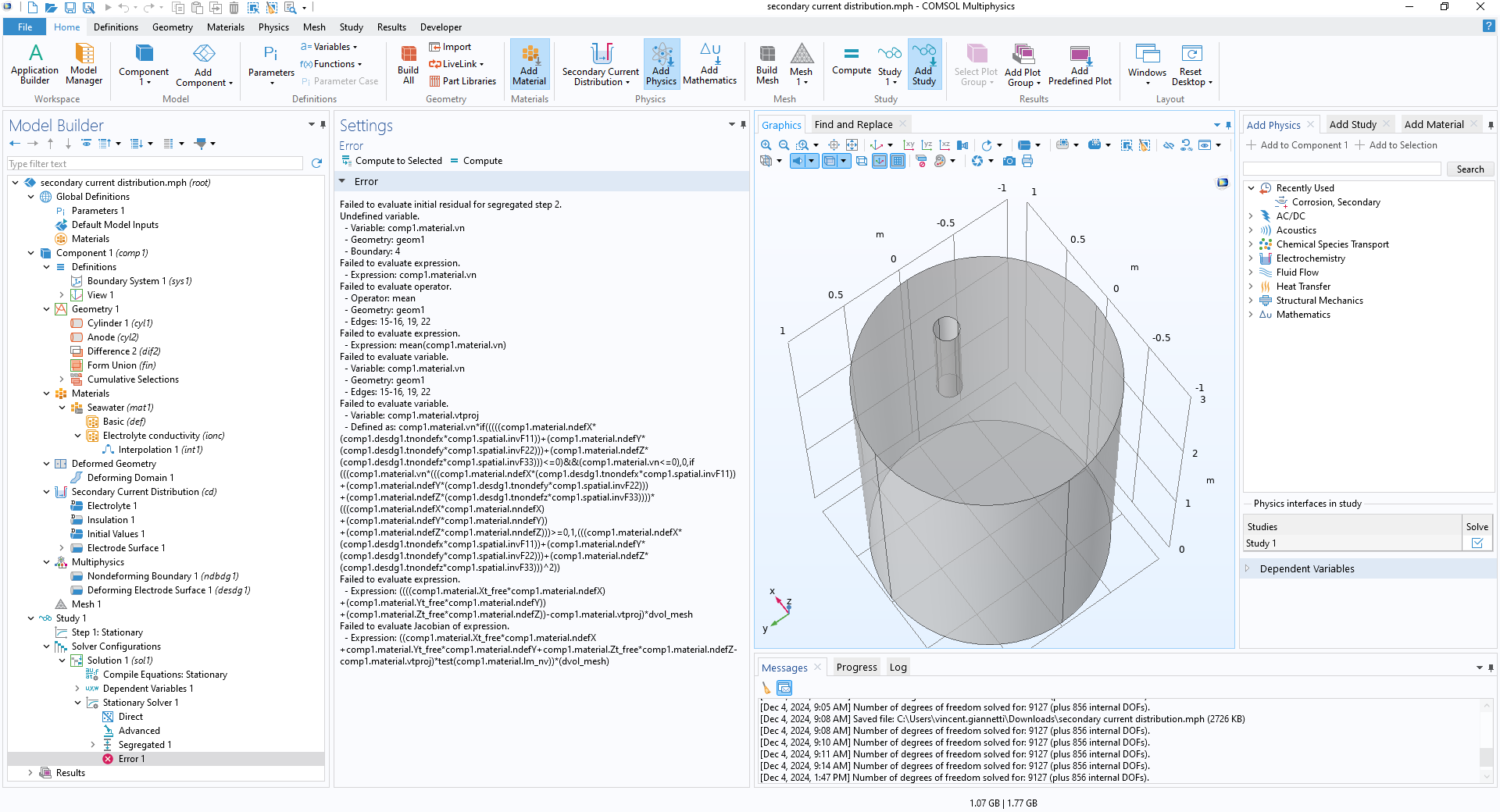 I have recently started working with COMSOL to model the corrosion effects of an anode in water with 3D simulation (Corrosion, Secondary physics). I am getting an error when attempting to compute the simulation as seen below. Boundary 4 of the geometry is the top surface of a cylinder with a hole in it, continuing into the cylinder to simulate an anode hanging from the top of a cylindrical tank of water.