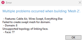 At a small scale the mesh compiles just fine. I'm able to mesh and run the physics simulation without any issues. But when I make one of the parts longer, the mesh crashes and I get an error: "Failed to create swept mesh for domain ... Unsupported topology of linking face" (photo error is also attached)