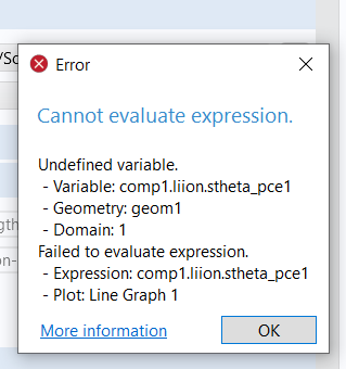 "Undefined variable. - Variable: comp1.liion.stheta_pce1 - Geometry: geom1 - Domain: 1 Failed to evaluate expression. - Expression: comp1.liion.stheta_pce1 - Plot: Line Graph 1"