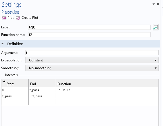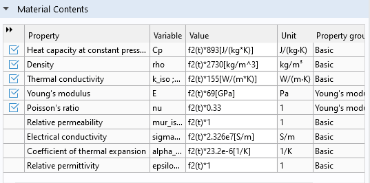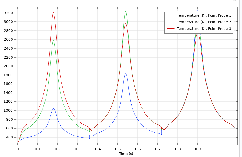 I'm trying to model a SLM process on COMSOL and I'm finding some issues on simulating the layer addition. For an initial test, I have the substrate and 2 more layers (the laser travels 3 times). In order to simulate their addition, I created piecewise functions that are 1 when the layer is active and 10e-15 when it's innactive, and I multiplied the physical properties of the material by the function. See images below to make it clearer. The GIF shows a zoom on the layers to better see the laser pass. However, when I use a point probe to measure the temperature inside the layers, it increases even when the layer in question is not supposed to be active. The plot below show the temperature in 3 points. Laser pass time is 0.36 seconds.
