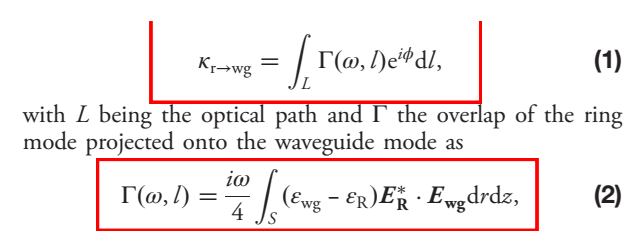 I am trying to calculate the coupling coefficient of ring resonator with a straight waveguide. I constructed the physical structure but still do not know how to apply the equation of coupling coefficient to get the value. i attached the equations.