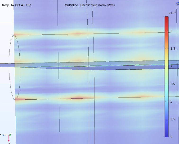 For my surprise, the propagation seen in my study was quite different from the original, and not commonly seen on theory. The electric field is pulsing during propagation length, with little concentration on the core and significant in the interface between core and clad.