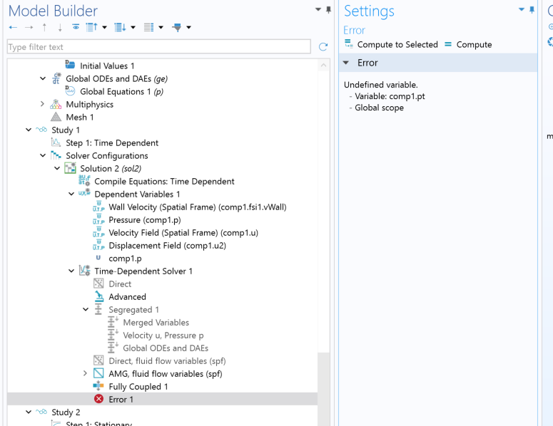 I am facing an issue in my COMSOL model that I have been unable to resolve for a few days now, even after multiple attempts and fixes. I am working on a time-dependent simulation of blood flow in the aorta (normal aorta and with coarctation), and I have added Global ODEs (RCR model) to model the pressure changes in the arteries. My Boundary conditions have been set to velocity inlet and outlets with pressure. My main issue is that when I try to run the simulation, I keep encountering the error: "Undefined variable - Variable: comp1.p" This happens both in time-dependent and stationary solvers. How do I fix this issue?