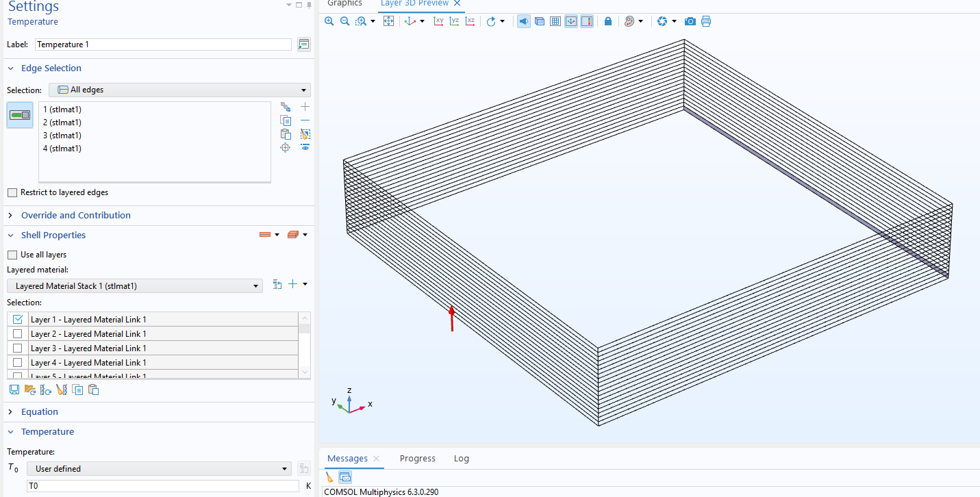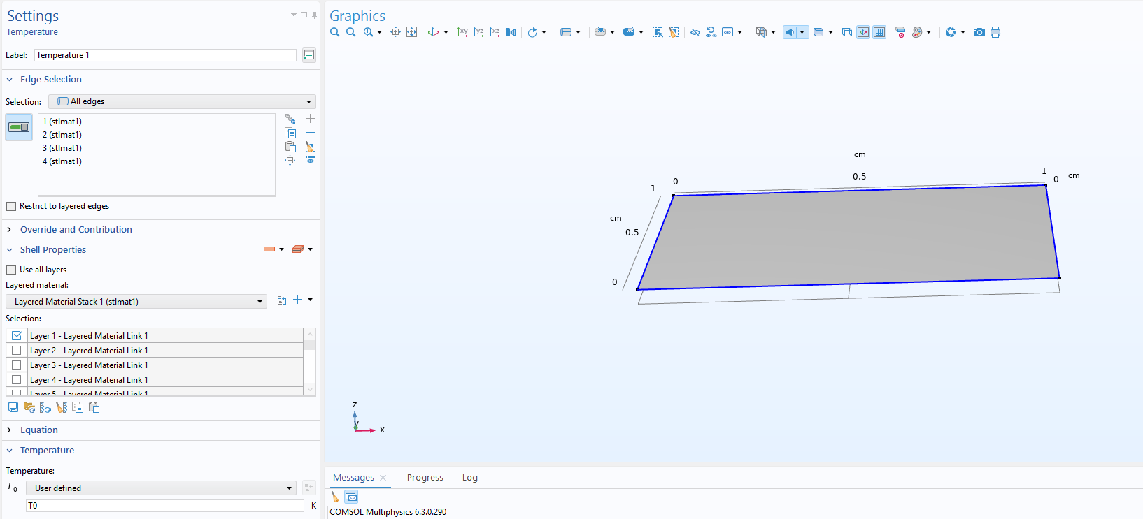 Hi, I am trying to model heat conduction through AS4 unidirectional fibre (matrix = peek, volume fraction = 50%). I defined a layered material (18 layers) in global materials, then built a rectangle in geometry and added a layered material link. I changed the thermal conductivity tensor to be anisotropic. I set the lower-most layer to be heat generating. but when i add temperature/ adiabatic boundary condition on the edges it shows me that not all the edges are set??