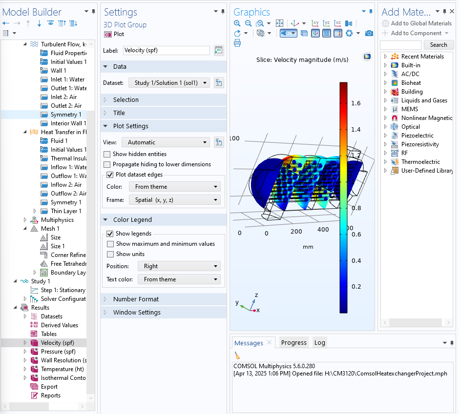 To save time for rendering, we were only making half a heat exchanger and then using the mirror 3D model section of the model builder to create the other half for the hydrodynamic plots.