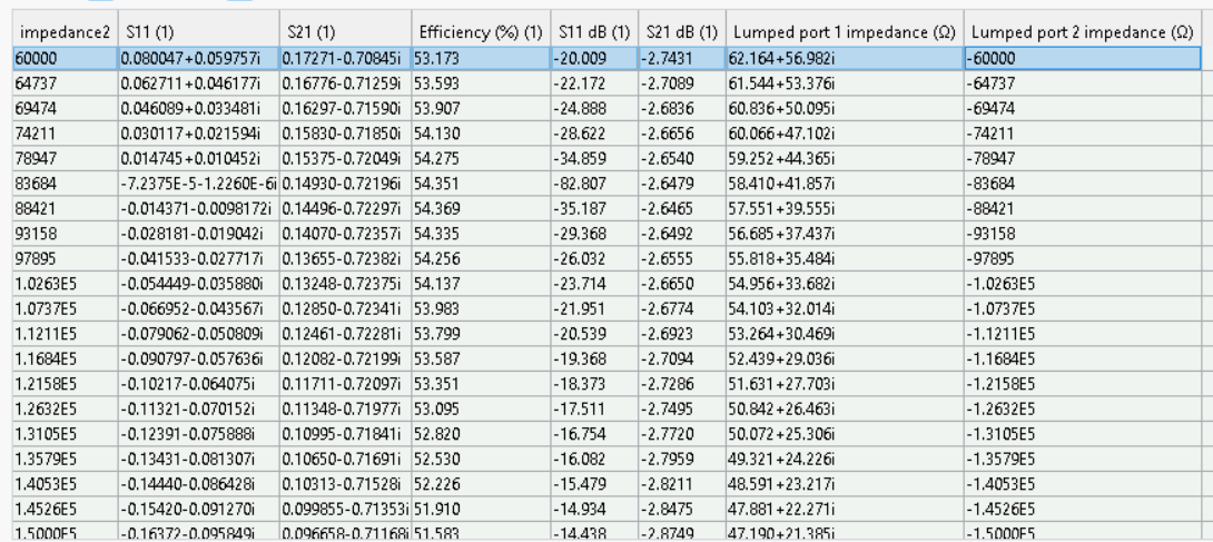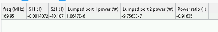 I instead printed out the powers of the two lumped ports, and take the ratio of those to get the power transfer efficiency. I am getting a negative power on the second lumped port. Is that because it is receiving power as opposed to outputting it?