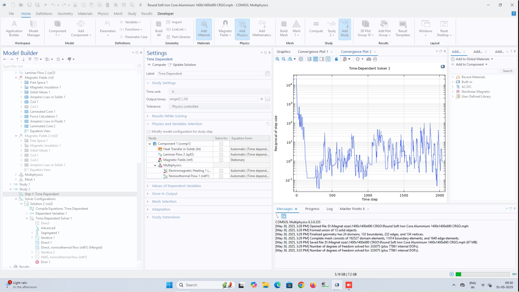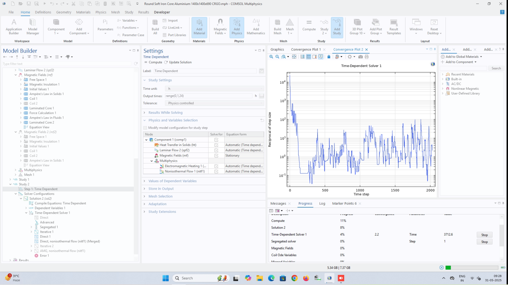 I am modeling an electromagnet with DC input at a constant voltage with the aim to understand the time-dependent changes in the conductivity, flux density, temperature and pull force of the equipment.