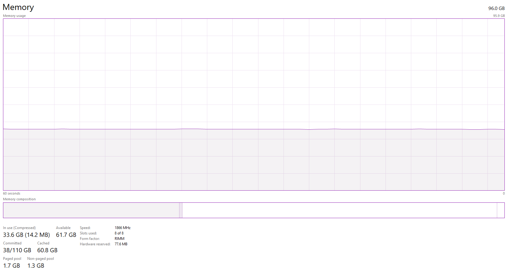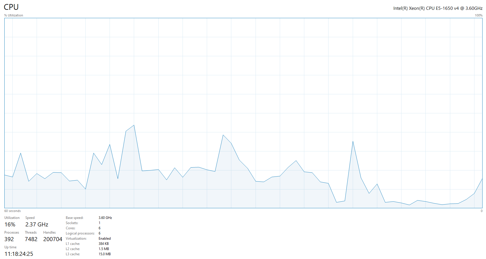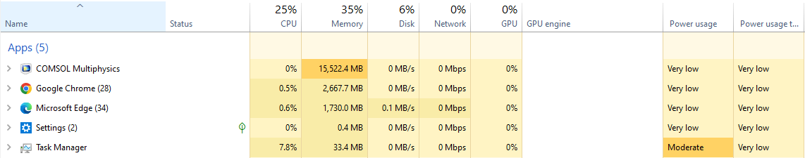 However, I’m seeing very slow simulation speeds. The simulation is around 45% complete after more than 10 days, and it seems stuck for the last 4 days. Monitoring system performance via the Windows Task Manager, I noticed: