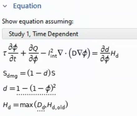 I am trying to reproduce the Phase-Field Damage + Solid Mechanics coupling using only Solid Mechanics together with a General Form PDE in COMSOL 6.3. In the built-in Phase-Field Damage model, the Equation View shows in the picture.