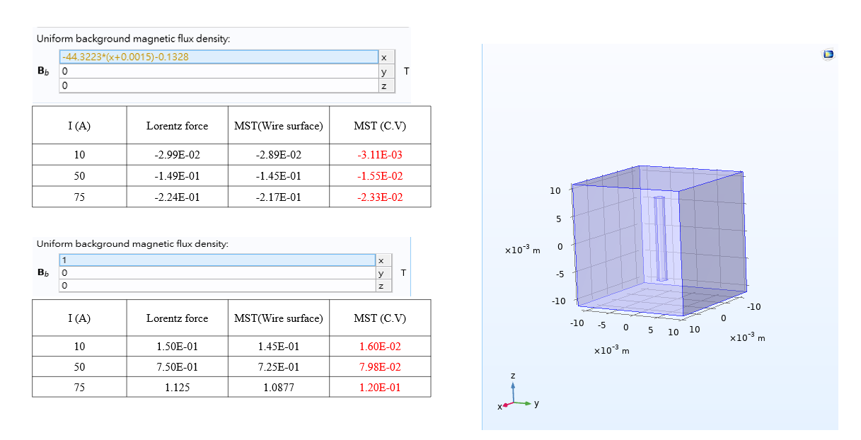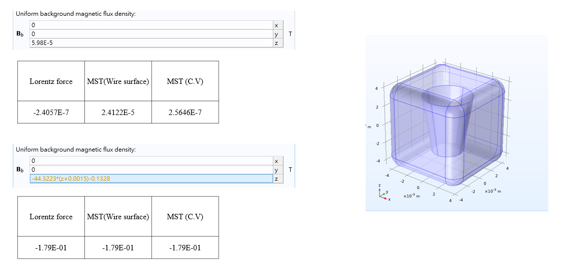 Under a non-uniform background magnetic field, the three methods (Lorentz force, MST over a cuboid control volume, and MST over the wire surface) produced consistent results.