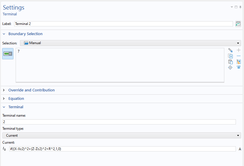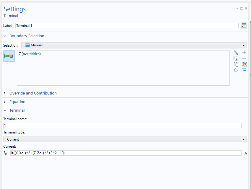 I am using the electric currents module and want to apply terminal and ground conditions to two circular partitions on a face. I replaced the ground another terminal to act as a sink (since the ground condition has no option to provide the equations).