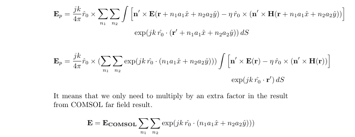 Hi guys. Now I am facing a problem of getting far field from an array. When calculating the near field, periodic condition is applied and only a single unit is calculated. But when I tried to apply far field node in the model, I think COMSOL only do stratton-chu equation on the single unit but not the whole array. Since I want to calculate the far field from the whole array, I think I need the integral on the whole surface of the whole array. Is there a solution for this problem now? Thanks!