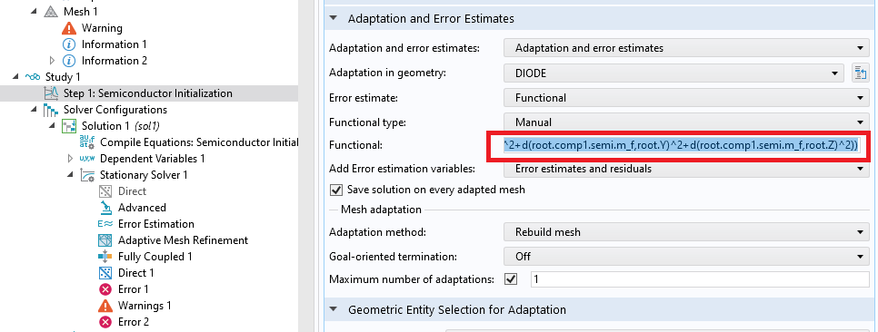 I was trying to use the Adaptation and Error Estimates functionality. In the Functional field, I entered: