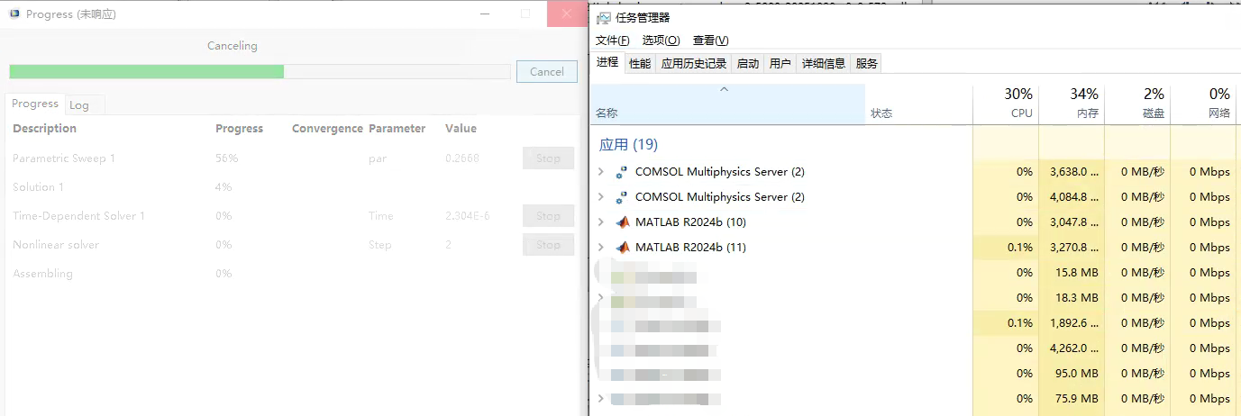 After several days' calculation, I pressed the Cancel button and tried to evaluate the situation, but something seemed to be stuck and the 'Progress' window becomes in the state of 'not responding' while neither COMSOL server nor MATLAB is running (see the attached screen snapshot).