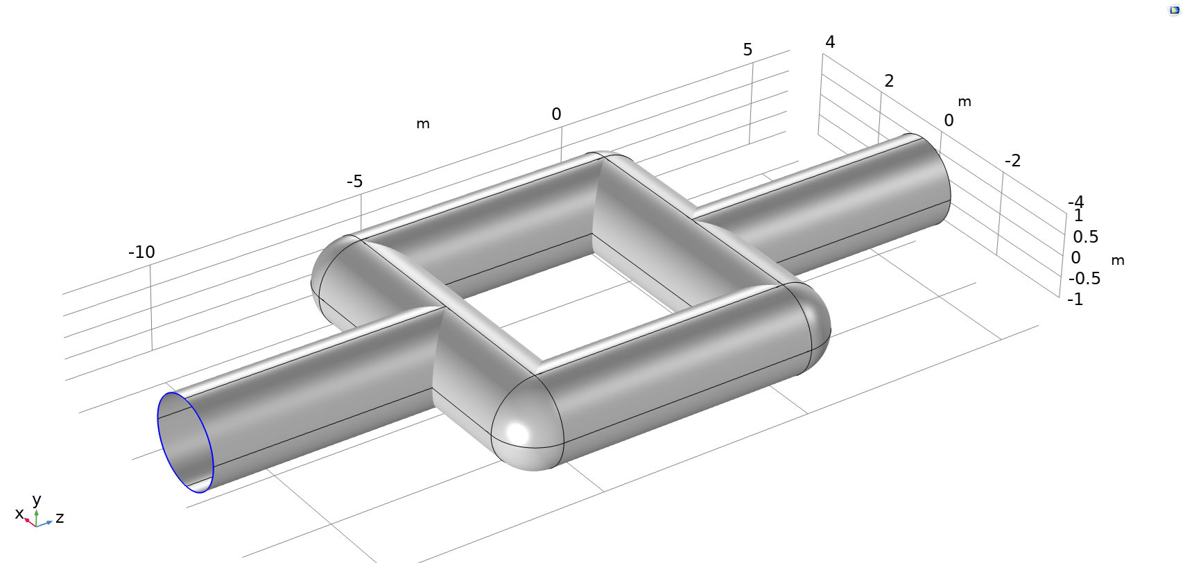 I have a COMSOL Multiphysics geometry as shown in the figure below. The model consists of a main pipe with an inlet at the upstream end and an outlet at the downstream end.