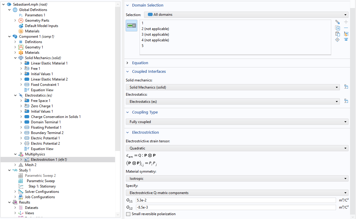 I have another question regarding the electrostriction effect: how can I add this effect? I used the coupling for electrostriction and added the Q electrostriction tensor, is this enough? It seems to me that I am missing something.