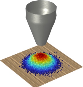 This example uses the Granular Flow interface to model the fixed funnel method for calculating the angle of repose, where a funnel is kept at a fixed height. The funnel is first filled with grains which are subsequently released and collected as a heap. The resultant heap is then analyzed using Model Methods to evaluate the angle of repose.