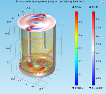 This example of turbulent flow in a partially baffled turbulent mixer shows how to set up The Rotating Machinery, Turbulent Flow interfaces from the Mixer Module with free surface and stationary free surface features. Both frozen rotor and time-dependent simulations are performed and compared.