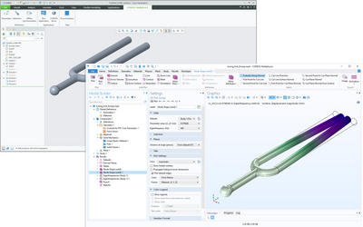 This model computes the fundamental eigenfrequency and eigenmode for a tuning fork that is synchronized from PTC Creo Parametric™ via the LiveLink™ interface. The length of the fork is then optimized so that the tuning fork sounds the note A, 440 Hz.