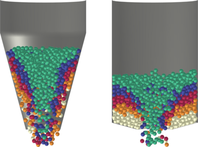 This model demonstrates the effect of the hopper design on the resulting flow patterns of the grains exiting the hopper. The flow changes from mass flow to funnel flow when the conical angle of the hopper is increased.