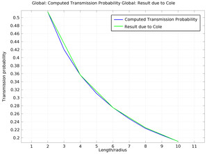 This model uses the Free Molecular Flow interface to compute the transmission probability for the molecular flow of molecules through a microcapillary with different length / radius ratios. The results are compared with the accurate solution as computed by Cole.