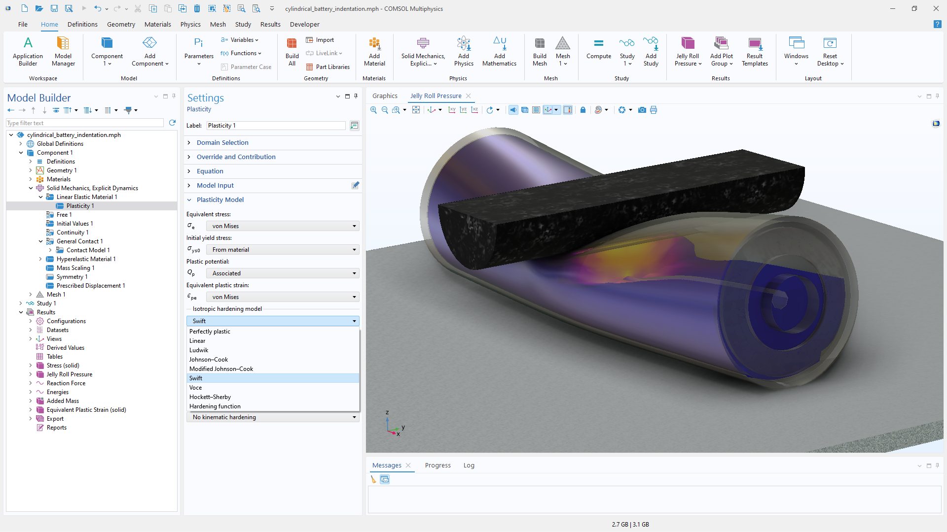 The functionality for modeling nonlinear materials augments all of the structural analyses available within the Structural Mechanics Module or the MEMS Module. Linear elastic, hyperelastic, or nonlinear elastic material models can be combined with nonlinear effects, such as plasticity, creep, viscoplasticity, or damage, and the versatility of the COMSOL Multiphysics® simulation software makes it easy to include multiphysics couplings with a couple of clicks. Users can define their own models based on, for example, stress or strain invariants and create their own flow rules, creep laws, and strain energy density functions for hyperelasticity.