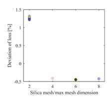 空芯光纤因空气芯的存在,理论上具备极低的光学非线性、色散与极高的损伤阈值,同时能够大大减弱了光纤材料吸收的影响,适合极端波长、大功率激光以及超短脉冲传输,在光通信、传感、微加工以及气体非线性研究等领域具有极大潜力。其中,反谐振空芯光纤因其简单有效的结构设计及低损宽带传输的特点而备受关注。这里我们利用COMSOL的波动光学模块对其进行若干数值仿真来研究针对此类具有大芯径-波长比和稀疏精细结构微结构空芯光纤的网格划分策略,并基于此进一步研究了反谐振空芯光纤的结构参数对其泄漏损耗以及材料吸收所引发的材料损耗的影响。我们通过对空气、石英和PML区域的网格进行不同程度的划分来研究网格疏密对于模式折射率结果的计算精度和收敛性的影响,发现计算结果对于石英区网格划分较为敏感,当网格最大单元尺寸被限制在1/4的石英中波长以下时,结果趋于稳定。此外,通过改变光纤结构参数并计算光纤损耗,发现此类光纤的限制损耗对于芯壁厚度和包层空气孔尺寸都非常敏感,而材料损耗的变化则主要取决于芯壁厚度,由此我们给出了低损反谐振空芯光纤的结构参数设计。