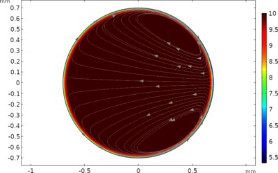 马兰戈尼(Marangoni)流是由液体表面张力梯度引起的流体流动现象。流体表面的温度梯度和溶质浓度梯度都可以形成表面张力梯度。本论文研究在一个准二维空间中的液滴由浓度梯度引起的马兰戈尼流。一滴水滴被夹在两个玻璃片之间形成一个薄的圆形液膜。在这个圆形液膜周围构造一个有梯度的有机溶剂(如乙醇)蒸汽浓度场,水滴表面不同位置溶解有机溶剂的量不同从而产生浓度梯度,进而形成马兰戈尼流。或者在溶解有表面活性物质的水滴周围构造不均匀的表面蒸发速率,同样能产生表面浓度梯度和马兰戈尼流。通过使用COMSOL我们可以方便的模拟流体流动,蒸发和稀物质传递相互耦合的问题。首先,使用两相流动网格物理场接口,我们能将表面张力写成与浓度相关的表达式就能实现马兰戈尼流的模拟。启用“浅槽近似”使得能在二维模型下得到准确的薄层液膜的流体仿真。溶质在水中的对流与扩散使用稀物质传递物理场,将流体的速度作为对流速度。有机溶剂蒸汽在空气中的扩散或水的蒸发同样使用稀物质传递物理场,边界通量与水中的稀物质传递相互耦合来模拟物质溶剂或蒸发。借助COMSOL使我们更好的理解这些复杂的耦合现象,从而有助于把这种流动现象运用到微流控器件中。