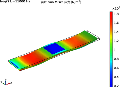 模型采用四分之一对称模型,将压电片嵌于铝板之中。确定压电片的压电柔度矩阵、压电应变矩阵、相对介电矩阵、密度、阻尼常数以及压电介电损耗系数等参数。模型采用固体力学和静电两个物理场接口,固体力学接口施加压电材料、固定约束和边界载荷三个子接口,静电模块施加电势和接地两个子接口。采用压电效应多物理场耦合接口。添加研究时首先对结构进行带预应力的模态分析,确定其固有频率。其次设定频域范围1KHz—3KHz进行研究计算。
