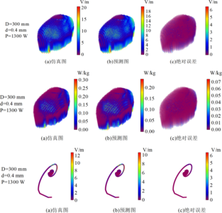 随着电磁设备的广泛应用,电磁辐射对植入式心脏起搏器患者健康的潜在影响引发关注。本文针对传统有限元方法计算时间长的问题,提出一种基于3D U-Net神经网络的方法快速预测微波炉泄漏电磁波对佩戴心脏起搏器患者产生的电磁暴露。研究通过COMSOL软件建立微波炉-人体胸腔-起搏器多物理场耦合模型,采用COMSOL Multiphysics®的RF模块进行多物理场耦合仿真,模拟2.45GHz电磁波在人体组织中的传播与能量吸收特性,利用参数化扫描生成多工况下的电场强度、比吸收率(SAR)数据,将仿真得到的电场强度和SAR作为神经网络的标签数据,之后对原始数据进行裁剪、补充、归一化处理后,作为神经网络的完整数据集。该模型将空间坐标和工况参数作为输入特征,电场强度和SAR作为输出目标,实现对患者感应电场和SAR以及在心脏起搏器中的感应电场的快速预测。 结果表明,该方法能够准确预测出植入心脏起搏器患者胸腔中产生的感应电场和SAR以及在心脏起搏器中的感应电场。基于3D U-Net模型实现了电磁场高效预测,单次耗时仅0.93秒,计算速度提升3880倍,相对误差低于1%,在保障精度的同时极大提高了效率,展现出显著的计算效率优势。