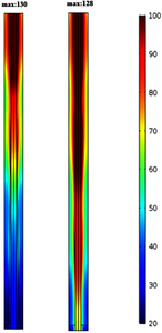 微波化学反应的研究,一般要求实验装置要具有尺寸小、工作频带等特点,基于这种要求,近年来一种同轴式的微波反应器应运而生。本文基于COMSOL Multiphysics® 软件,对两种不同结构的同轴式微波反应器进行对比分析。结构主体是由外导体和内导体形成的同轴腔体,内外导体由金属材料构成可承受一定的高压反应。反应器一端为短路面,另一端结构一填充了截锥形聚四氟乙烯插件,结构二为填充了一定厚度的柱形聚四氟乙烯。我们建立了两种结构的二维轴对称模型,通过电磁波-频域接口、层流接口以及流体传热接口对其进行模拟计算,探究不同介质下反应器的加热效果。数值仿真结果如图2、图3、图4所示,两种结构的同轴式微波反应器在处理低损耗介质(混合物料1)时均有较好的加热效果;处理高损耗介质(混合物料2)结构2 相对于结构一呈现出更加显著的加热不均匀性,说明其对物质的介电性质更为敏感,这在微波化学反应的研究中是不合适的。结果表明,我们优化过后的反应器相对于原有装置具有更宽的适用范围,具进一步优化开发的潜力。