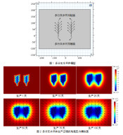 模型不考虑地层温度变化,对固体力学与达西渗流场进行耦合。对于渗透率较低,厚度较薄的储层,可以看做纵向均质地层,工程上可以使用二维模型。图1为多分支水平井地质模型,地层假设为矩形区域,分布有两口相互平行的鱼骨状多分支井的水平段,上部为趾端,下部为跟端。将地层边界设置为固定约束边界,同时赋予地层初始压力P0,水平井跟端施加压力Pw,采用瞬态模型求解器计算。图2是多分支水平井生产过程的地层压力模拟图,随着生产进行,压力降由井筒逐渐向外传播,使地层流体形成拟径向流。模型的建立对油田现场制定合理的开发方案具有指导意义。