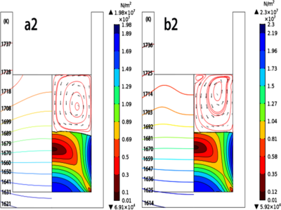 多晶硅真空定向凝固过程本质上是一个热科学的问题,其整个过程中涉及的传热、熔体流动、热应力与晶体生长相互协同、相互作用。因此,探究定向凝固过程中传热特性、熔体流动行为、热应力大小以及不同下拉速率对晶硅铸锭内的位错、晶界等缺陷之间的影响规律的深入理解是获得高质量晶体和高效多晶硅的前提和基础。 为此初步建立了多晶硅真空定向凝固过程的温度场—速度场—应力场耦合模型,模型中主要使用固体传热、表面对表面辐射、固体力学、层流和动网格物理场接口以及Marangoni效应等多物理场接口。通过模拟计算发现Marangoni对流会导致硅熔体流动速度增大3倍以上,因此使得硅熔体的对流换热能力得到加强,单位时间内通过底部水冷换热带走的热量就会增大,进而使得坩埚内硅料纵向的温度梯度增大,最终使得硅锭中的热应力增大,从而影响晶硅形貌和质量。 其次在设置不同的动网格移动速率(即坩埚下拉速率)时,发现硅料的纵向温度梯度会随着下拉速率的增大而增大,因此在以较大下拉速率下拉时硅锭内部的应力值也会相应的增大,同时也会影响凝固时固液界面的形貌。通过数次模拟计算发现在下拉速率为10μm/s时硅锭内部的应力值对于制备位错较少、形貌较好的多晶硅最为合适。