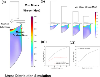 大直径区熔法(FZ)硅单晶(尤其是8英寸单晶)是制造绝缘栅双极晶体管(IGBT)和快恢复二极管(FRD)等高压器件的关键材料,但其生产受限于脊状断裂缺陷导致的晶体生长成品率低下。本研究以量产型8英寸(100)晶向与5英寸(111)晶向单晶为对象(后者用于研究体缺陷传播),探究8英寸区熔法硅单晶中夹杂物诱导的脊状断裂机制。通过扫描电子显微镜、能谱分析和机械化学抛光技术,我们识别出两种失效机制:表面源碳夹杂物(可能源自初始加热阶段石墨件磨损产生的碳化硅颗粒)会诱发孪晶形成,而体源微晶硅夹杂物则引发位错和裂纹。此外,我们建立了基于COMSOL的多物理场耦合数值模型,集成轴对称近似下的电磁-热-应力场分析。数值模拟揭示:单晶中心与边缘的高应力区域会放大夹杂物效应,且应力随直径呈线性增长,从而加剧8英寸单晶的断裂风险。通过建立应力-夹杂物相互作用模型,我们阐释了夹杂物如何缩小晶体耐受的应力窗口。这些发现表明,通过优化预制棒制备工艺和加热过程以减少夹杂物,可有效提升8英寸区熔法硅单晶在高性能电子器件应用中的成品率。