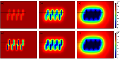 改进拉链式压裂技术是将拉链式压裂和交替压裂相结合,第2口井中产生的裂缝处于第1口井产生的两条裂缝之间,具有更大的应力干扰作用范围,储层改造体积更大。在开采过程中,两口井裂缝区域存在缝间干扰,明确裂缝干扰区域的渗流场及基质、裂缝间地层压力变化规律十分重要,对压裂施工中压裂位置的优化具有重要意义。 忽略储层厚度及温度的影响,采用二维模型,建立了页岩基质,天然裂缝,人工裂缝的多重介质渗流耦合模型,描述了页岩气生产过程中的页岩气流动状态。改进拉链式压裂井模型如图1,地层为300m×400m的矩形区域,人工主裂缝间距50m,井筒近似为直线,二者差集为图1的模型。对整个模型添加渗流物理场,基质压力场与天然裂缝压力场存在正向的质量源,人工主裂缝存在于天然裂缝介质中。左边界为对称边界,其他边界为无流动边界,地层初始应力为P0,井筒施加固定流压Pw,采用瞬态模型求解器计算。随时间变化的基质场自由气浓度和天然裂缝场自由气浓度变化云图如图2。