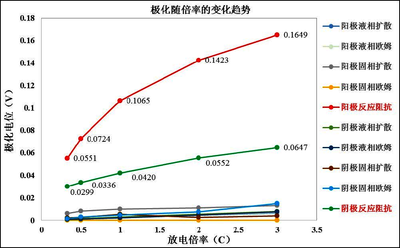 通过上述模型设置,我们可以得到电池在不同倍率下极化占比情况及极化占比随时间、倍率而变化的情况,从而分析出影响倍率、温升、恒流比等电性能的影响因素,同时电池设计开发者可沿此方向来优化电池性能。