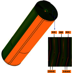 运用COMSOL Multiphysics 5.4软件锂离子电池接口建立18650圆柱电池全三维模型。首先,拆解18650电池,对电池内部结构有一个详细的了解,为建模做好准备。建模前应确定各部分材料及几何尺寸,18650电池几何尺寸为直径18mm,高度65mm。确定正负极层及隔膜的高度;确定涂层材料、相应的克容量、材料压实密度以及活性物质的比例,计算得出涂层厚度。正极集流体为铝箔,负极集流体为铜箔,选取铝箔、铜箔以及隔膜的厚度,计算出正极层、负极层、以及两层隔膜的厚度和,进而计算得出卷绕层数。运用各几何参数在COMSOL软件中建立电池的全三维模型结构如图1所示。建立几何模型后,可以采用不同热模型进行仿真,例如电化学模型、电-热耦合模型、热滥用模型。得出相应的结果后可以对电池进行几何优化,甚至是材料配比的优化,也可以建立相应电池包进行热管理分析以及优化。
