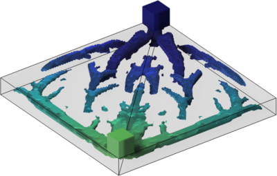对液流电池双极板流场结构进行优化,是提升电池电化学性能、降低泵功率损耗,并进一步改善系统工作稳定性与循环寿命的关键路径之一。本文聚焦于半电池构型,采用拓扑优化方法开展新型流场结构的设计研究。图1展示了DES基钒铁液流电池半电池模型,该模型包含多孔电极区域、入口域与出口域,其中多孔电极被设定为拓扑优化的设计域。在COMSOL Multiphysics® 中建立了相应的拓扑优化数学模型,采用立方体网格进行离散化处理。基于变密度法构建拓扑优化数值模型,初始化设计变量?,并明确目标函数与约束条件。通过有限元法求解控制方程,结合伴随法进行灵敏度分析,并采用移动渐近线法(MMA)实现迭代优化。为验证拓扑优化方法的有效性,将优化所得流场结构(Opt)在半电池中的输出电流与蛇形流场(Ser)、指形流场(Int)及贯通流场(TF)结构进行了对比,不同流场电极一体化结构几何形状图如图2所示。结果表明,拓扑优化流场在所有测试工况下均表现出最高的输出电流,尤其在电极孔隙率为0.8时优势最为显著。在孔隙率为0.8与0.85条件下,贯通流场结构输出电流最低,而指形与蛇形流场性能介于其间,在所有工况条件下,拓扑优化流场结构表现出最佳的反应传递性能。