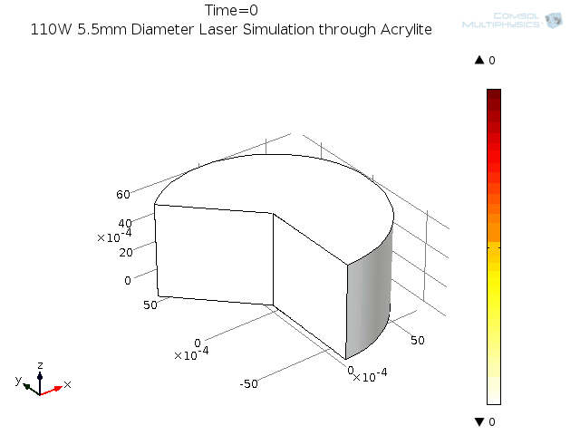 In this paper we present a transient numerical model of the heat transfer and thermochemical damage evolution in an IR translucent material using COMSOL Multiphysics. The model is evaluated using literature supplied and experimentally determined material properties for carbon black laden PMMA (polymethyl-methacrylate). This variant of PMMA was chosen because it is homogeneous, isotropic, and the decomposition from solid to gas is relatively straightforward to characterize. The incident high energy laser beam is modeled as a Gaussian heat flux. The beam parameters used for this study were selected to mimic that of a Nd:YAG high energy laser with a wavelength of 1070nm, an output power of 110W, and a spot size with a 5.5mm beam diameter. At this wavelength, NIRS/FTIR experiments have measured that PMMA absorbs approximately half of the incident laser energy. PMMA was also experimentally observed to vaporize from 310°C to 475°C via differential scanning calorimetry. The temperature range and endothermic phase change from solid to gas is incorporated in the COMSOL model. Rather than use an adaptive mesh, material removal (or drilling) was captured using temperature and phase dependent material properties. The model captures vaporization material removal by appropriately varying the thermal conductivity and density of the PMMA at the vaporization temperature. The model results are compared to experiments on carbon-laden PMMA.