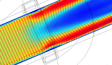 This article considers a closed water circuit with square cross section filled with an electrolyte fluid. The conductor fluid was moved using an electromagnetic pump, in which a permanent magnet generates a magnetic field and electrodes generate the electric field in the flow. Thus, the movement is a consequence of the magnetohydrodynamic (or MHD) effect. The model adopted here was derived from the Navier-Stokes equations for Newtonian incompressible fluid using the k-ε turbulence model and coupled with the Maxwell equations. The equations were solved using COMSOL Multiphysics®. The 3D numerical simulations allowed obtaining realistic predictions of the Lorentz forces, the current densities, and the movement of the flows as a consequence of the MHD effects, imposing direct currents.