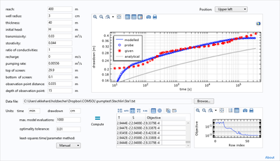 The parameter estimation is performed using the COMSOL® Optimization Module. While T and S parameters are determined by default, other unknown parameters can be included in the estimation procedure, such as the reach of the well, the thickness of the aquifer, initial position of the water table, groundwater recharge and the ratio of hydraulic conductivities. The model was verified using data performed for tests in confined aquifers, which were also handled by the common 1D approach. Moreover, in most applications it was possible to improve the fit in comparison to the 1D evaluation. It is intended to extend the current model to deal with pumping tests in unconfined and leaky aquifers.The figure shows the Pump Test App, developed using the COMSOL® Application Builder. The input parameters and their values are listed on the left of the panel. Below one finds the button to browse the file with the input data recorded during pumping. The ‘Compute’ button below initiates the model run. In the left bottom corner some options of the optimization solver can be specified. The model output is shown in the center graph, depicting measurements and model output for the optimized parameter set. The parameter values are listed in the table below. The plot on the lower right visualizes the advancement of the objective function during the optimization process.