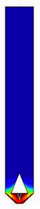 The flow simulation of solid, particulate materials is still challenging, even though estimations show that three-quarters of products and raw materials are present as granules form in the industry. We can think of grain in the agriculture, raw materials of the glass industry, granulated products of plastic industry, etc. The large-scale storage of these substances is frequently carried out in silos. Design and optimisation of the silos is a challenging task. One of the main obstacles is to measure the parameters of these systems since the measurements change the flow conditions, so we do not get real data. Another task to be solved is to influence the flow conditions. During the discharge of the silos dead spots are caused by funnel flow or segregation. Inserts can be built into the system, and are used to influence the flow. The inserts are objects inside the silos, which can be occurred in several shapes and forms to achieve the desired effects. There are two main methods for modelling these systems. The discrete element method (DEM) is a numerical method in which we define each particle of the material, and we calculate the parameters separately for each particle in each moment by specifying boundary conditions. The other method uses computational fluid dynamics (CFD) simulators. In this case, the solid-gas system is considered as a pseudo-plastic fluid. Thus the flow in the system can be simulated. In this study, a laboratory scale silo was examined. The silo is a quasi 2D device, which can be used for video recording based validation. These types of devices can be used to understand the inner behaviour of the system, with less computational time, when we think of simulation. Two different coloured plastic particles were used for the experiments (white as bulk, and black as tracer layer). Residence time distribution was used for the validation of the model. The system was implemented in COMSOL Multiphysics®, using a non-newtonian fluid to model the solid system as a continuum. Figure 1 shows results with one insert.