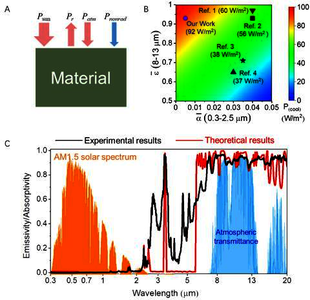 随着人类日常活动对制冷需求的不断增加,传统散热系统不仅消耗大量的能量,而且产生过多的废热和CO2的排放。外太空作为温度只有3K的冷源,热量通过大气透明窗口可以产生显著的辐射散热,特别是在白天仍然可以实现零能耗的降温。白天辐射制冷功率Pcool (Tr )可以写成: