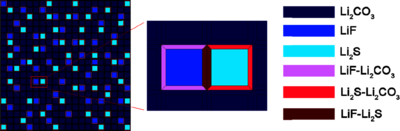 锂金属固态电池中,枝晶生长刺穿电解质导致电池短路是电池失效的重要因素之一。研究表明在Poly(vinylidene difluoride) (PVDF)-based固态电解质和锂负极界面会形成稳定非均一纳米界面层,起到高电流密度下自开路作用,从而避免过流引起的安全问题。 通过飞行时间二次离子质谱(TOF-SIMS),X射线光电子能谱分析(XPS),俄歇电子能谱(AES)确定出PVDF-LiFSI|Li界面层是由Li2CO3,LiF,Li2O和硫化物形成的非均匀马赛克结构。这种多相结构以Li2CO3为基,存在Li2CO3-LiF,Li2CO3-Li2S和LiF-Li2S三种界面。为了对这种多相非均匀结构的离子电导率和电子电导率进行模拟,设计出了一种二维砖块近似结构,目的是为了能够涵盖单相和相界面性质。再提供单相和两相界面的电导率性质从而可以预测多相界面层的可能导电性质。这一模型和实验协同解释了在锂金属聚合物固态电池负极侧界面的自保护原因。