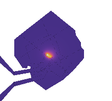 Calibration drift of temperature sensors is a well-known problem which adversely affects process control, particularly at high temperatures. Some new approaches are being developed [1,2], but degradation of resistive sensor elements is hard to prevent. To overcome this, graphene, which has desirable electrical properties such as a relatively high, tuneable resistance, has been encapsulated in hexagonal boron nitride (hBN) to protect it from oxidation. This involves nanofabrication of the hBN/graphene/hBN stack on a silicon/SiO2 wafer. Etched electrodes connect the graphene to external bonding pads to enable resistance measurement. Resistance measurement requires the application of a current, which causes Joule heating; this must be well understood. A coupled electrical and thermal model is implemented in COMSOL to quantify this Joule heating. The high aspect ratio (several mm across and tens of nm thick) causes some challenges with the modelling which can be overcome using domain partitioning and swept meshing. Transient coupled Electric Currents and Heat Transfer in Solids interfaces are used to apply a current across the electrodes (necessary to determine the resistance). The resulting Joule heating causes a temperature rise, which is the aspect of interest here due to its influence on the use of graphene as a temperature sensor. A swept mesh is used to handle the high aspect ratio geometries, with the use of a distribution node to ensure at least two elements along the thickness. This is complicated by the number of different crossovers between the layers. This can be resolved by partitioning the domains so that the geometry is more suitable for swept meshing. To manage the complexity, only two of the 10 electrodes are modelled. Because a convective heat transfer boundary condition is applied on all surfaces, the temperature rise depends on the convective heat transfer coefficient. As, in use, the device will be enclosed in a protective sheath, a coefficient of 5 m-2 K-1 is used [3], yielding a temperature rise of the entire assembly of approximately 4 mK (applied current 10 microAmps), with a localized peak in the temperature of the graphene. The underlying Si wafer acts as a heat sink. The model will be employed to examine both the stationary and transient ‘self-heating’ characteristics of the device, and the findings will be used to optimise its geometry. A key development making use of the graphene sensor element is a novel Johnson noise thermometer, which enables inherently driftless thermometry. More widely, the device offers the potential for more stable resistance thermometry above approximately 400 °C. The improvements in process temperature control by eliminating calibration drift mean better energy efficiency, better product consistency and yield, reduced pollution and reduced greenhouse gas emissions.