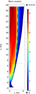 De Laval nozzles are used in supersonic aerodynamical tubes and engines. They are also employed for the production of cold gas jets to be used in chemical reactions studies. Recently, cold gas jets have been proposed of In-Gas Laser ionization Spectroscopy (IGLIS) The nozzle has a converging and a diverging part with a throat between them. High gas pressure and temperature, and low velocity are present before the converging part, while low pressure and temperature and high velocity are reached after the diverging one. For the IGLIS experiments a uniform jet of noble gas (argon or helium) with Mach number up to 12 is required. The nozzle design includes viscous effects and to account for them, COMSOL Multiphysics® has been used. Disagreements of the Mach number within 6% with respect to the nominal values are reached.