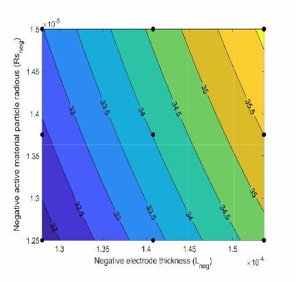 In the present study, a methodology based on design of experiments (DOE) is proposed to evaluate the response of a cell when internal design parameters are changed. A physics-based battery model implemented in COMSOL Multiphysics® simulation software and developed by G. Plett et. al. [1] is used for the analysis. This electrochemical model is linked using the LiveLink™ for MATLAB® in order to analyse the effects and interactions of internal battery parameters by means of DOE. The mathematical framework of this model is based on the work of Newman et.al [2] and the cell parameters used for the validation of this methodology are taken from Doyle et. al. [3 - 4]. The cell is constructed with Carbon and Lithium Manganese Oxide (LMO) electrodes and the electrolyte is a mixture of lithium hexafluorophosphate salt (LiPF6) and commonly used organic carbonate solvents (Ethylene Carbonate (EC) and Dimethyl Carbonate (DMC)).