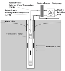 A fully coupled multiphysics model involving heat transfer and groundwater flow within a SCW and its surrounding ground was implemented in COMSOL Multiphysics 4.2a with MATLAB to simulate a 24-hour heating operation. The heat pumps were modeled using interpolation functions thereby allowing the effect of the pumped water temperature on the capacity and coefficient of performance of the heat pumps to be accounted for. In the model presented here, a three level bleed control is applied when the temperature of the pumped water drops to 7, 6 and 5°C. If the pumped water temperature drops below 4°C, an off-loading sequence implemented via a MATLAB function allows the heat pumps to automatically shut down one by one at 10 minute intervals.