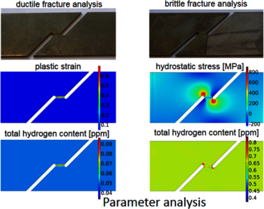 The prediction of material damage induced by hydrogen transport mechanisms is a major challenge for the development of new steel concepts. Especially the ultra-high strength steel concepts (UHSS), like dual phase and martensitic steels, can exhibit a higher vulnerability to hydrogen induced damage. The main reason for this is the complex microstructure, including a large number of several features. To evaluate the security of possible material applications in respect to the hydrogen context, an innovative combination of physically motivated simulations and representative experiments has been realized.